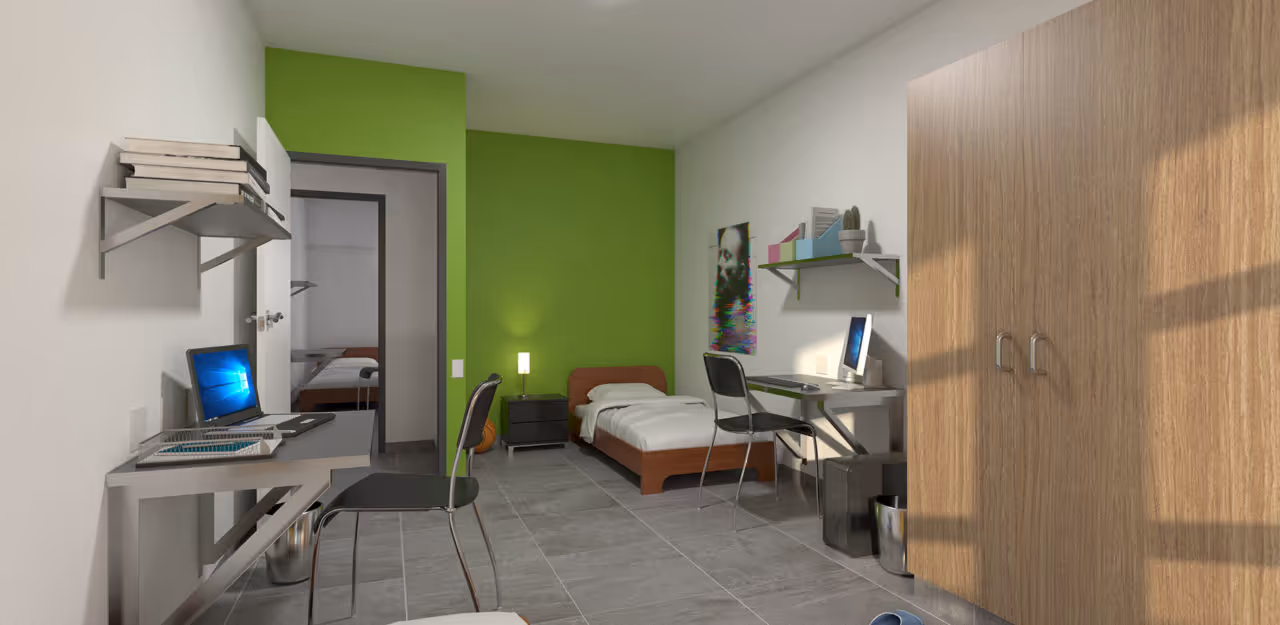Each bedroom has sufficient cupboard space for each student, a desk and chair for studying and an electric wall heater. Double rooms have a middle partition that gives each student privacy without isolating the roommates from each other.